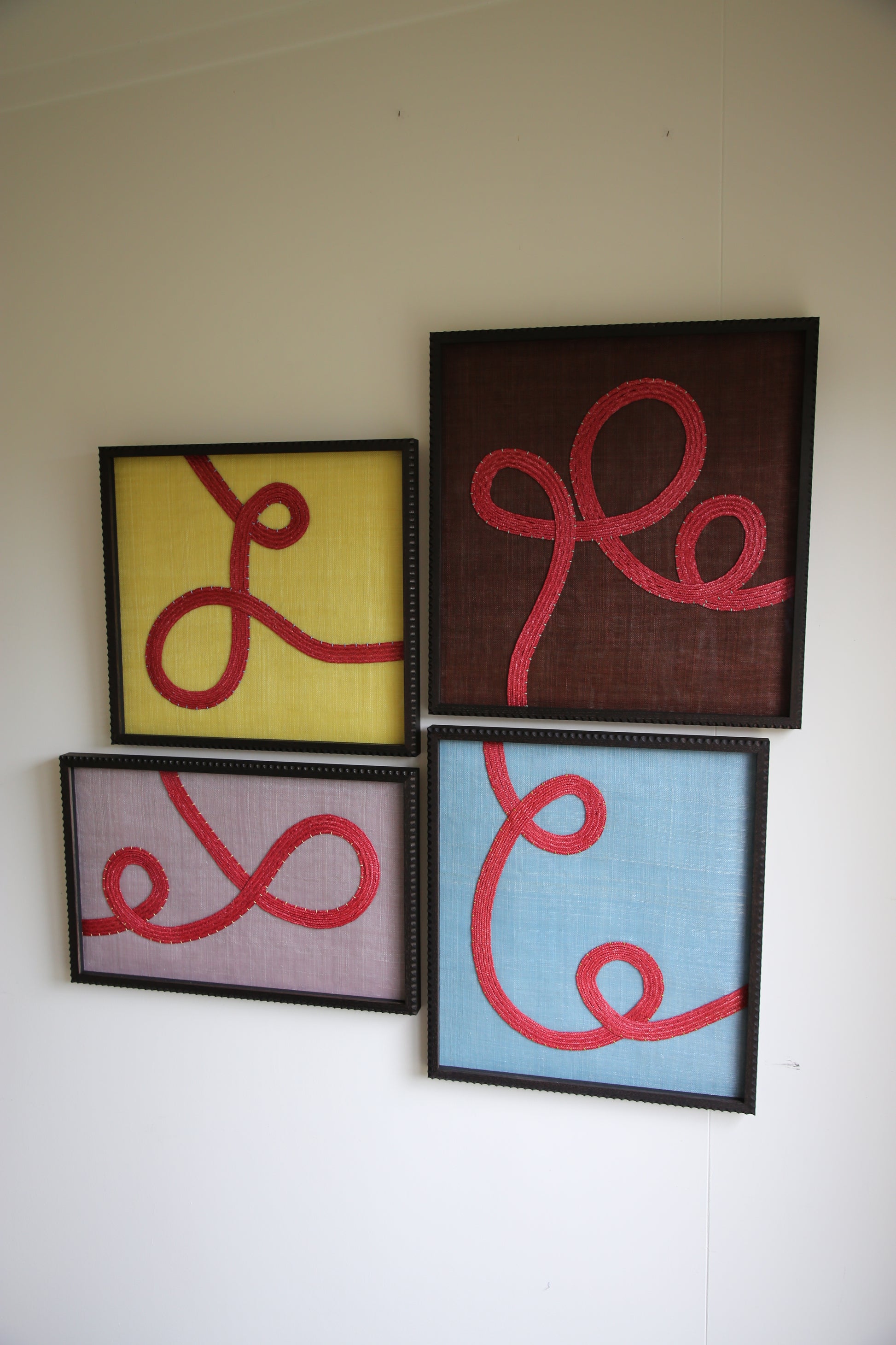 Materials: Wheat straw braid, cotton embroidery thread, a woven natural fibre derived from the banana plant family.