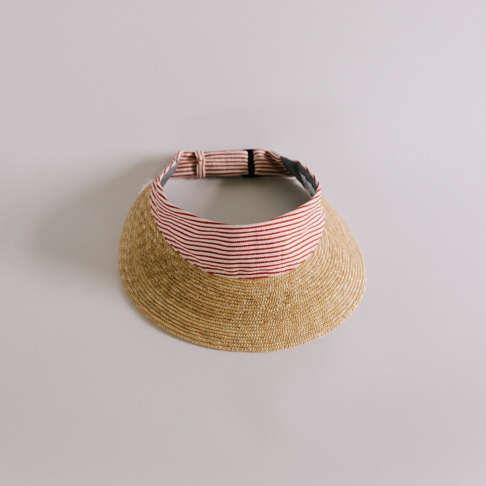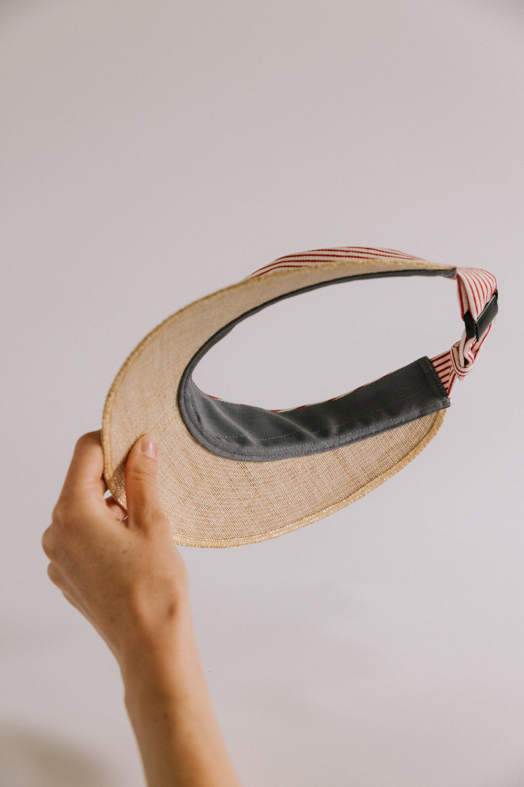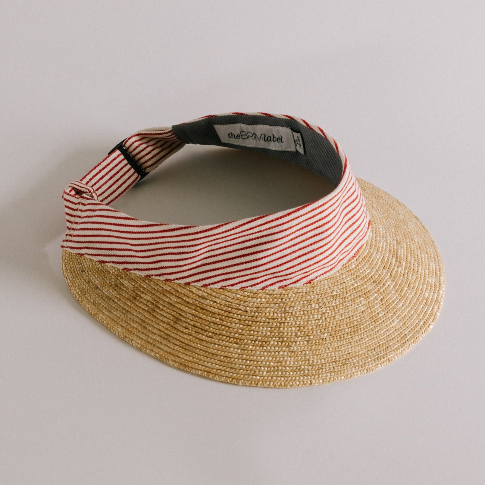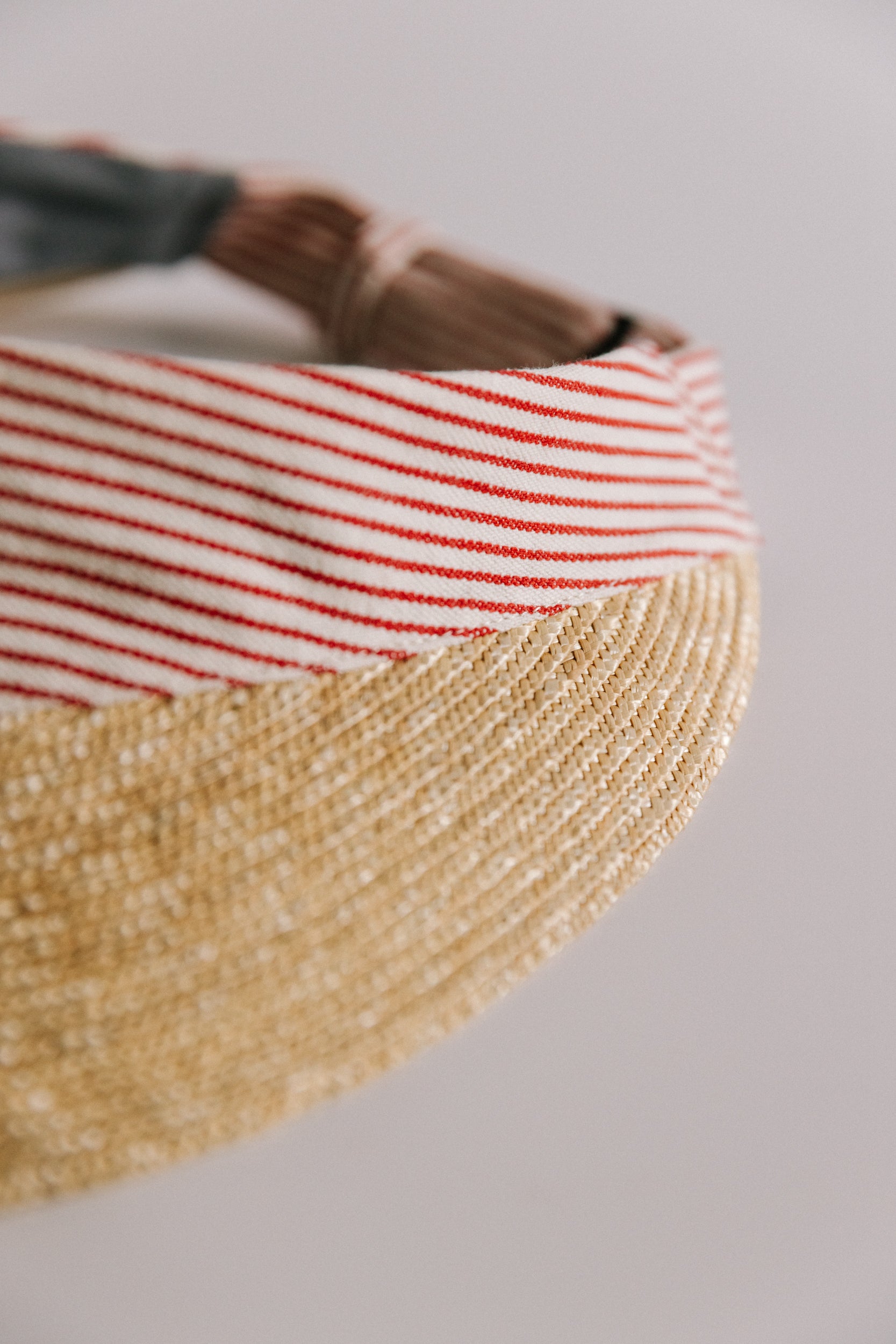 Narrow strips of straw are individually machine sewn together row by row in The Brim Label studio to create the intricate, lightweight straw brim of the Rosa and Eliza visors. Available in two lengths - Rosa (pictured) has a peak measuring 6.5cm at its longest point. Eliza has a longer peak measuring 10cm at its longest point.